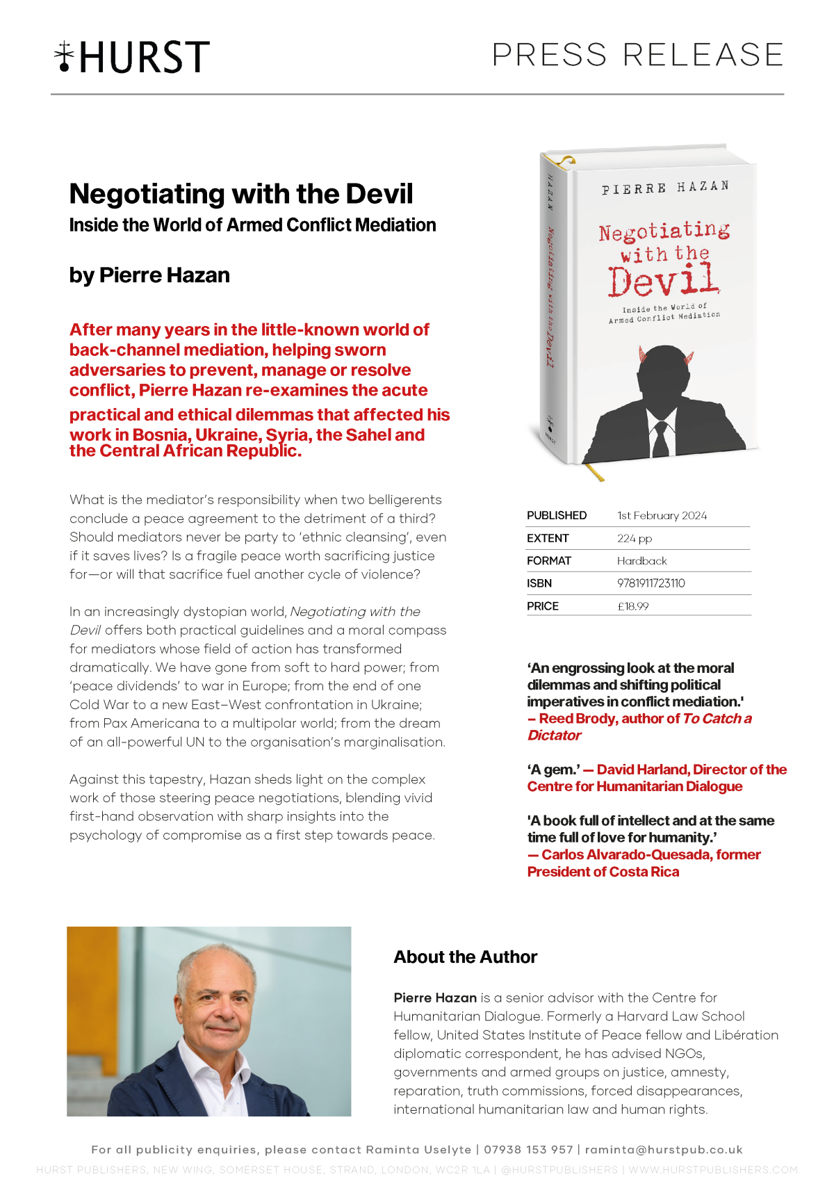 After many years in the little-known world of back- channel mediation, helping sworn adversaries to prevent, manage or resolve conflict, Pierre Hazan felt compelled to re-examine the acute practical and ethical dilemmas that affected his work in Bosnia, Ukraine, the Sahel and the Central African Republic. What is the mediator’s responsibility when two belligerents conclude a peace agreement to the detriment of a third? Should mediators never be party to ‘ethnic cleansing’, even if it saves lives? Is a fragile peace worth sacrificing justice for—or will that sacrifice fuel another cycle of violence? In an increasingly dystopian world, Negotiating with the Devil offers both practical guidelines and a moral compass for mediators whose field of action has transformed dramatically. We have gone from soft to hard power; from ‘peace dividends’ to war in Europe; from the end of one Cold War to a new East–West confrontation in Ukraine; from Pax Americana to a multipolar world; from the dream of an all-powerful UN to the organisation’s marginalisation. Against this tapestry, Hazan sheds light on the complex work of those steering peace negotiations, blending vivid first-hand observation with sharp insights into the psychology of compromise as a first step towards peace.